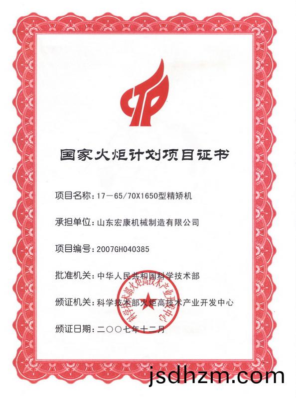 國(guo)傢火炬(ju)計劃(hua)項(xiang)目(mu)證書