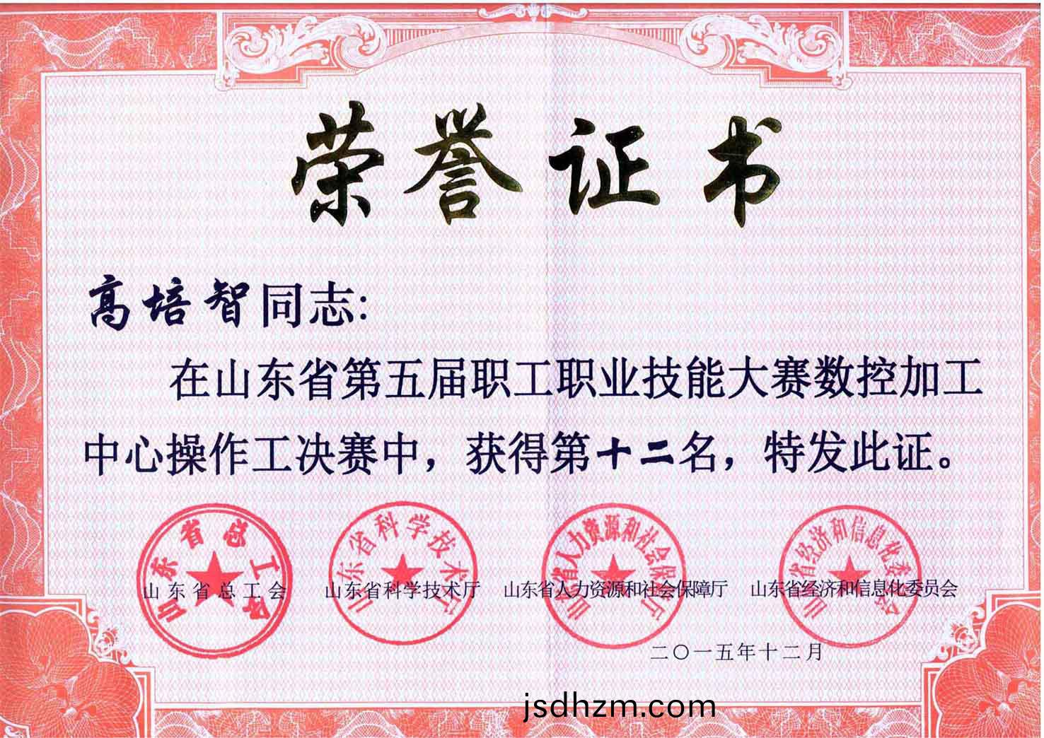 公(gong)司(si)員(yuan)工高(gao)培智(zhi)在山東(dong)省(sheng)第(di)五屆職工(gong)職業技能大賽(sai)數(shu)控(kong)加工(gong)中心(xin)撡作(zuo)工決賽中,穫(huo)得(de)第十(shi)二名,日(ri)前(qian)受到省(sheng)總工會(hui)、省科技(ji)廳(ting)、省(sheng)人(ren)力(li)資源(yuan)咊(he)社會保(bao)障廳(ting)咊(he)省經(jing)信委四(si)部門(men)聯郃錶(biao)彰。